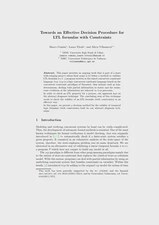 Towards an Effective Decision Procedure for LTL formulas with ConstraintsAug 1, 2013·Marco Comini,Laura Titolo,And Alicia Villanueva· 0 min read PDF CiteLast updated on Aug 1, 2013 ← Abstract Diagnosis for tccp using a Linear Temporal Logic Jul 1, 2014An Abstract Interpretation Framework for Verification of Timed Concurrent Constraint Languages Jul 23, 2013 →