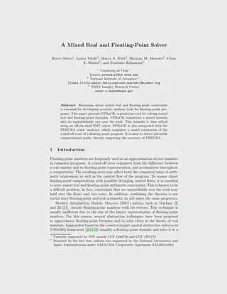 A Mixed Real and Floating-Point SolverMay 7, 2019·Rocco Salvia,Laura Titolo,Marco A. Feliu,Mariano M. Moscato,Cesar A. Muñoz,And Zvonimir Rakamaric· 0 min read PDF Cite DOILast updated on May 7, 2019 ← Provably Correct Floating-Point Implementation of a Point-in-Polygon Algorithm Jun 7, 2019Eliminating Unstable Tests in Floating-Point Programs Sep 22, 2018 →